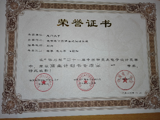 2016年8月20日,由我系硕士研究生梁添、龙志军以及信科学院薛团辉组成的厦门大学瑞达团队,在电磁声学研究院助理教授刘海老师的指导下荣获 “华为杯”第十一届中国研究生电子设计竞赛商业计划书专项赛一等奖,也是近年来我校参赛作品当中唯一的一等奖。
