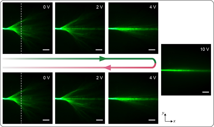 液晶具有丰富的相态和拓扑缺陷,这些缺陷有助于形成面内液晶分子取向无序的结构化图案(称为纹影织构)。这种无序取向导致了液晶膜的介电各向异性非均匀分布,其充当光传播的弱无序势。这种无序势的相关长度大于传播光的波长,满足形成分支流的条件。液晶的电光效应允许对无序势进一步调谐,在外加电场的情况下,液晶分子沿着电场排列改变了无序势场,并最终演化为有序排列。值得注意的是,由于拓扑缺陷在电场下的稳定性,这种调谐过程是可逆和可重复的。也就是说,电压调控可以实现打开和关闭分支流,并且可以通过外加电压定量地调节分支特性(图1)。此外,由于液晶的光学各向异性,光子的无序势也可以通过入射光的偏振来操纵,为分支光流的定量调谐提供了另一种方式。